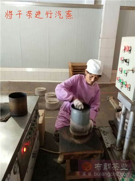圖二是將稱量好的毛茶進(jìn)行汽蒸,通過高溫使干茶變軟,蒸茶,把茶蒸軟,茶膠溶出,茶才能壓緊。